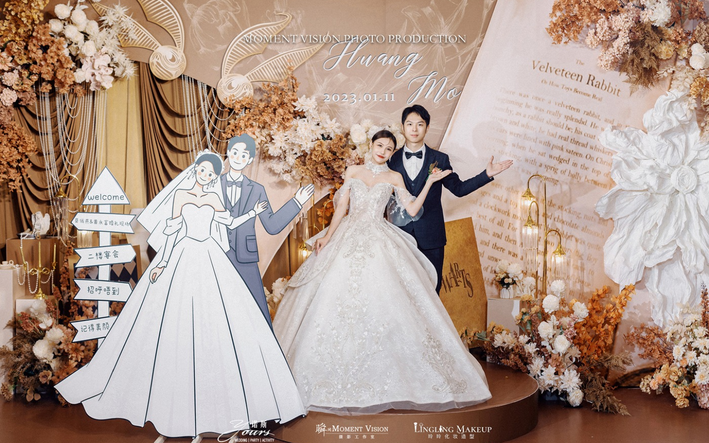 1.留影区背景-平面多层类,约长6m*高3m 2.留影区基础面光灯6台 3.婚礼迎宾牌1块 *该布置花艺为仿真花搭配 *留影区消费满5k可重新设计,具体费用可联系客服 *具体尺寸需按实际场地规划,变化较大会影响费用 *价格仅包含婚礼布置费用,具体费用可联系客服